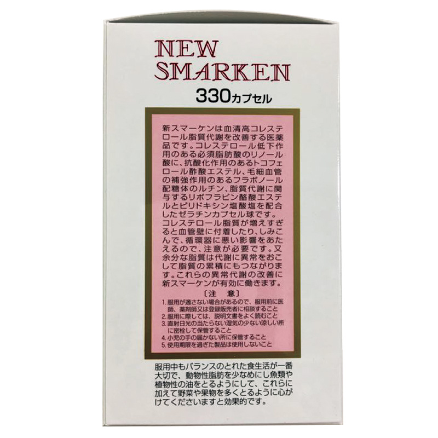 スマーケン是一種含有改善膽固醇脂質代謝作用的明膠膠囊球,配方中包含必需脂肪酸亞麻油酸和維生素B6的吡哆醇鹽酸鹽,以及醋酸生育酚酯。