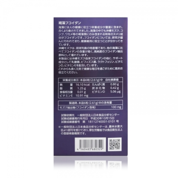 藥師堂褐藻醣膠,主要有來自沖繩的海藻-mozuku又稱海蘊、藻付,是一種類似髮菜的褐色海藻,產於沖繩天然海域的珊瑚礁中。能調解生理機能、促進新陳代謝並維持健康、增強體力且快速被人體吸收。沖除了來自沖繩藻的海藻mozuku外,本產品還含有乳酸菌、雙歧桿菌、乳鐵蛋白、維生素D、維生素E。是提供您健康維持、補充營養的不二之選。適合病後補養、想要增強體力、調節生理機能、日常營養補給之人群服用,素食亦可食用。